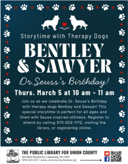 Storytime with Therapy Dogs Bentley and Sawyer: Dr. Seuss’s Birthday! @ Public Library for Union County (Lewisburg)