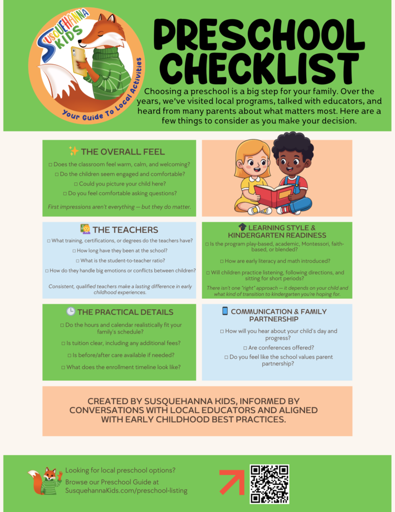 Our Susquehanna Valley Preschool Listing is an incredible tool to help you pick the BEST spot for you and your little one! It’s important to remember that most preschools give priority to current families and then they open spots to the public. If your dream preschool is already full be sure to ask to be put on the schools waitlist!